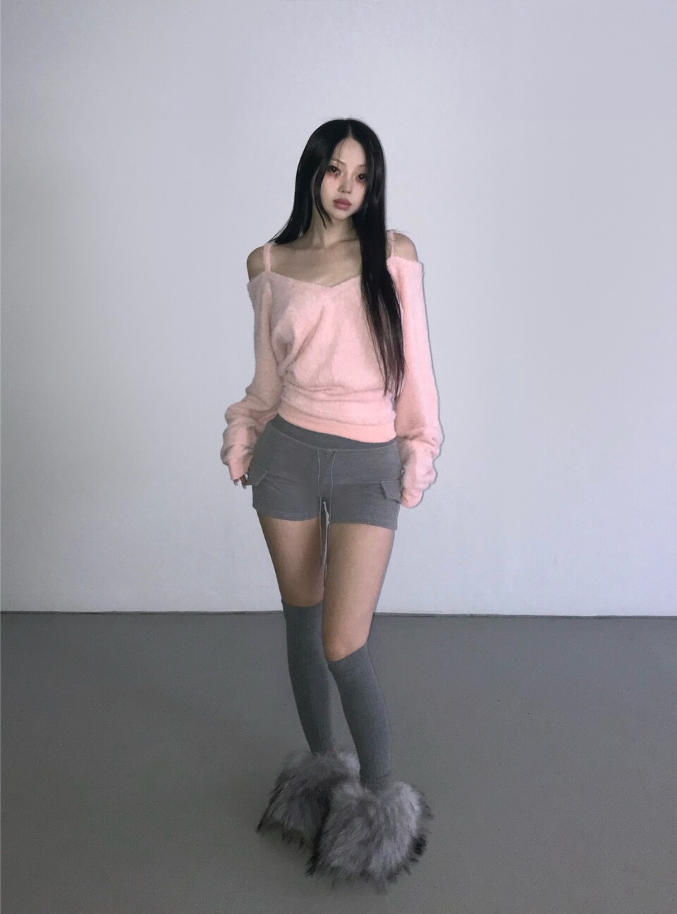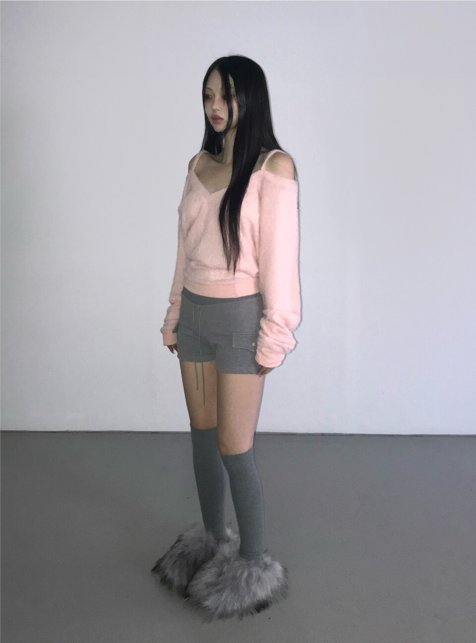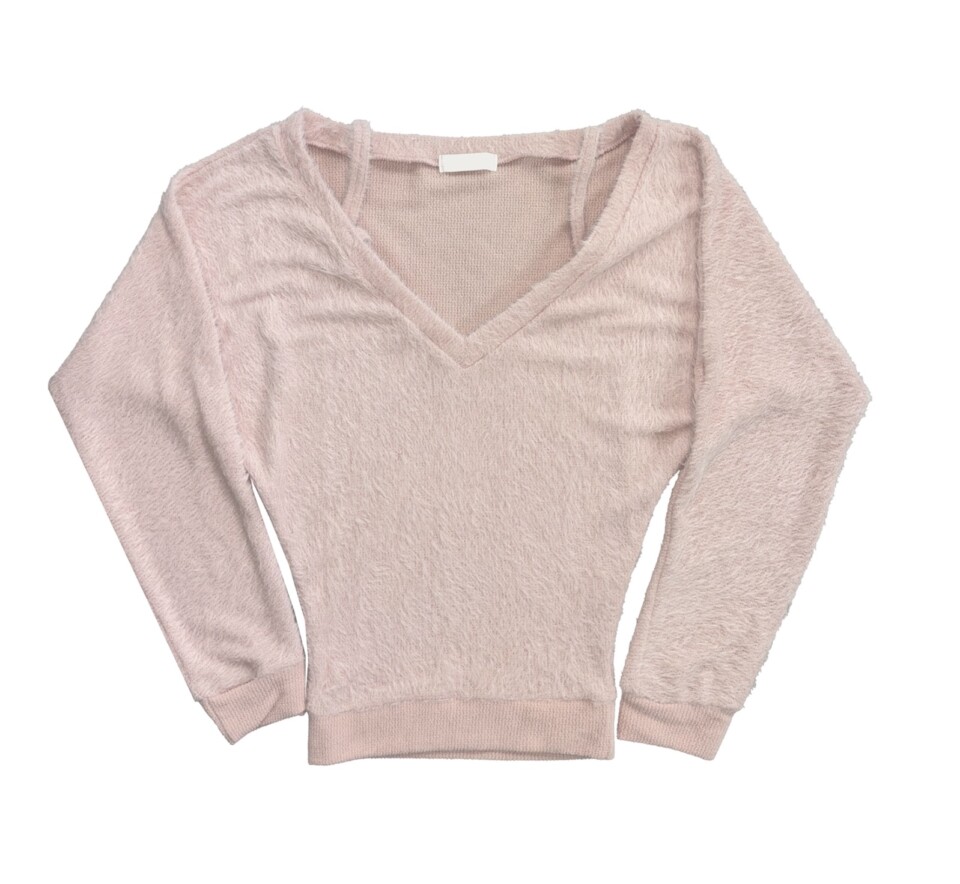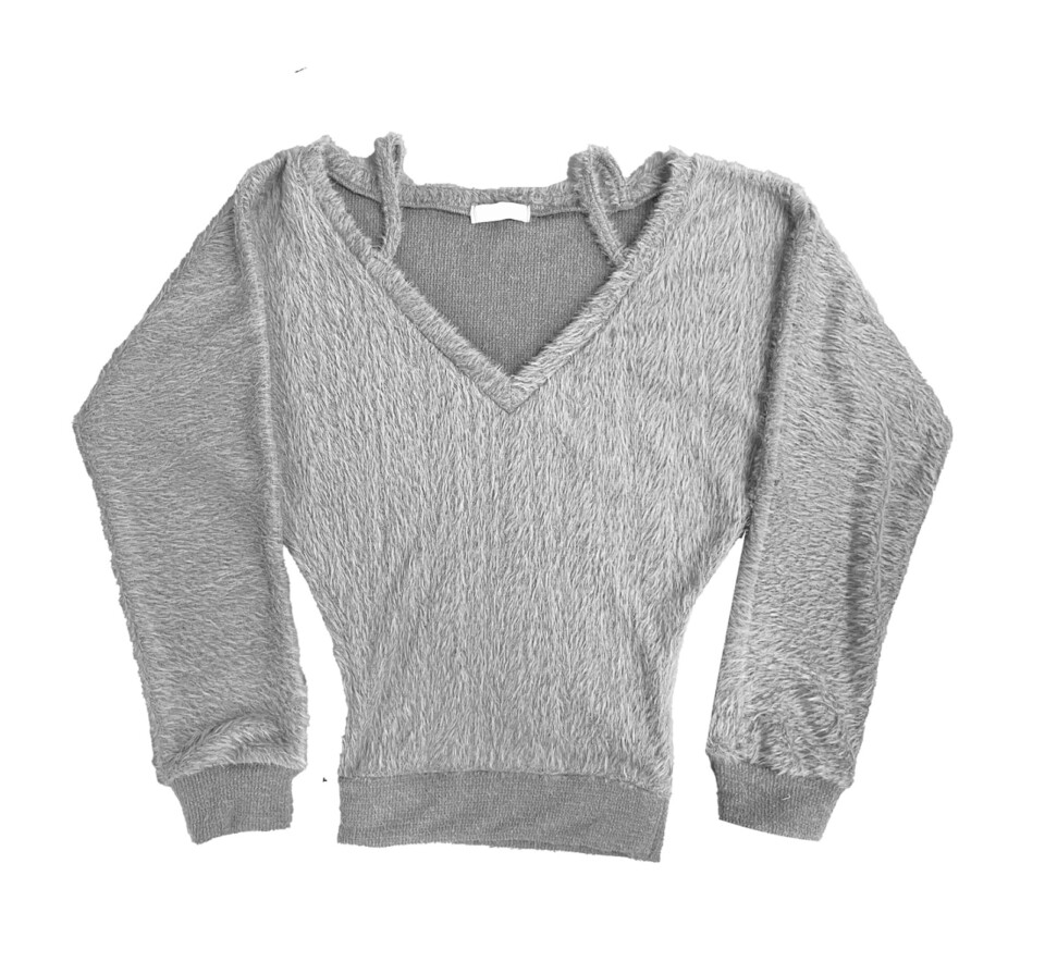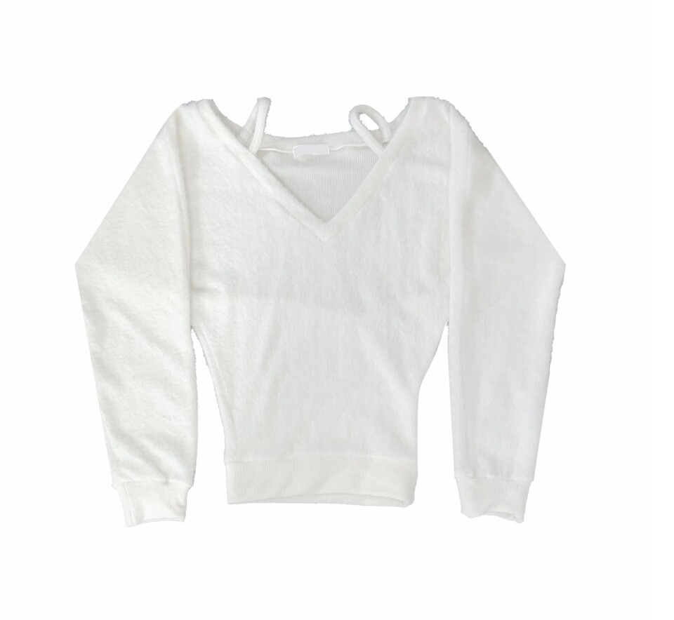 細肩帶露肩毛絨針織衫