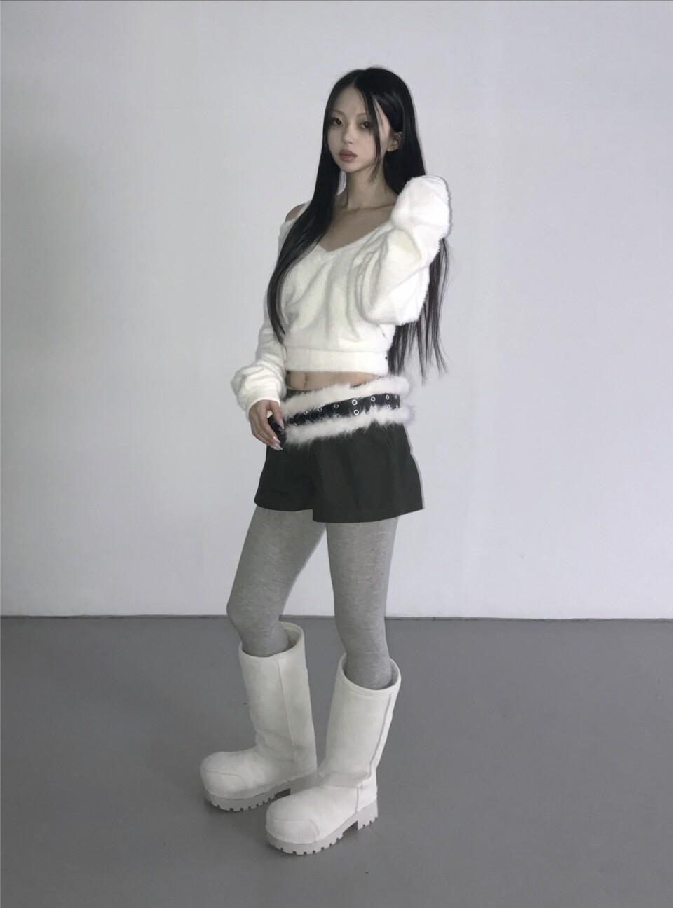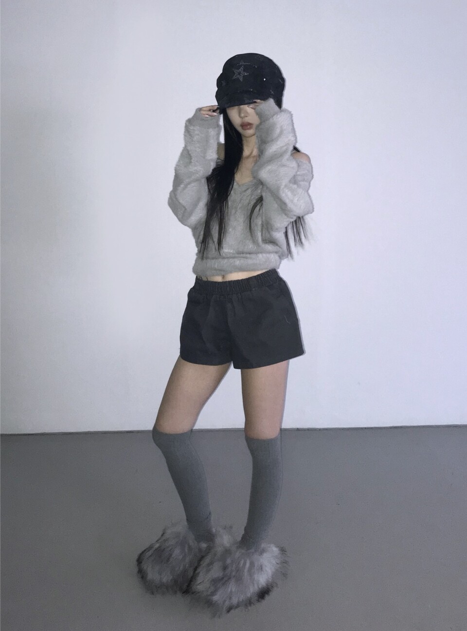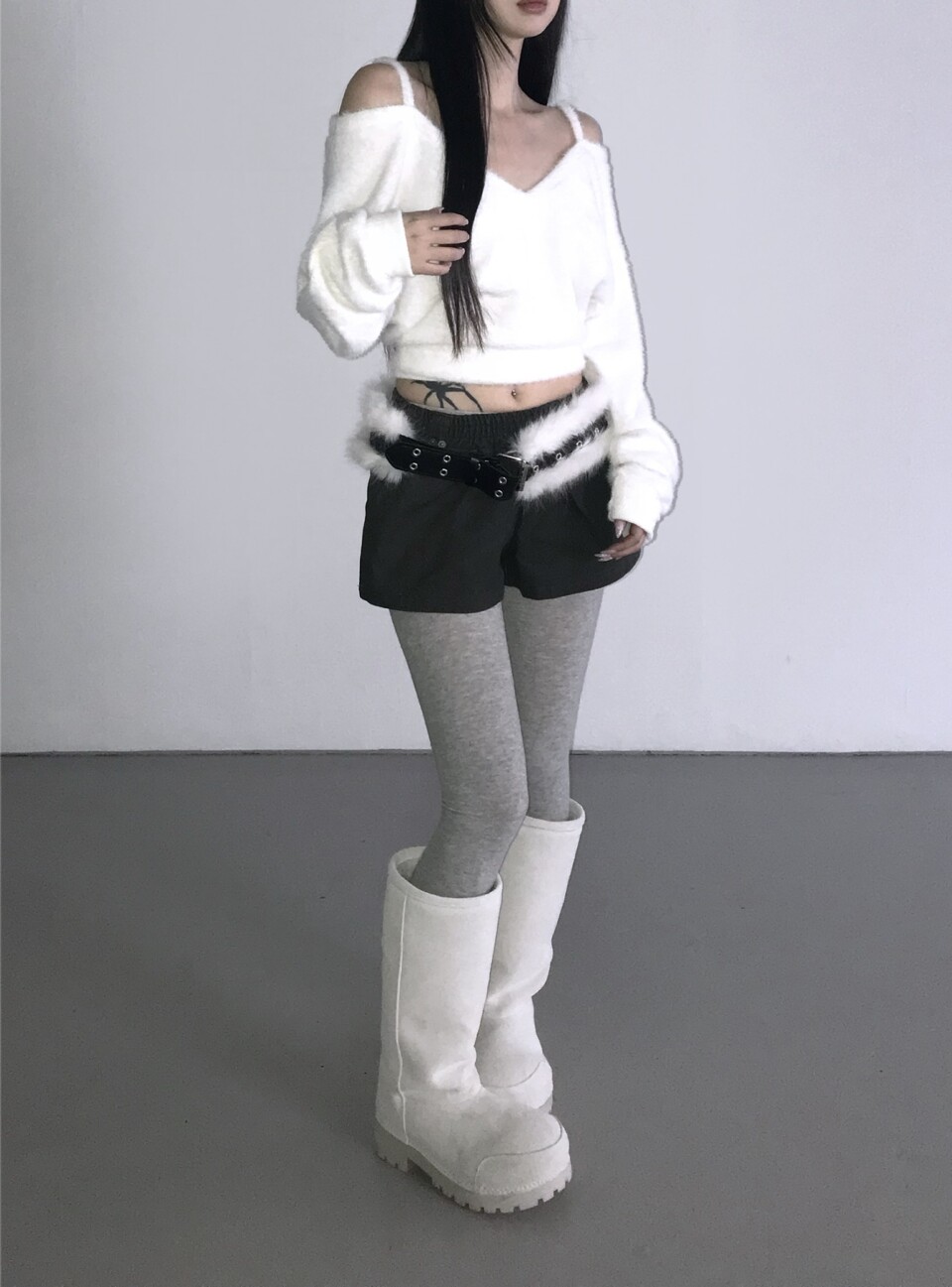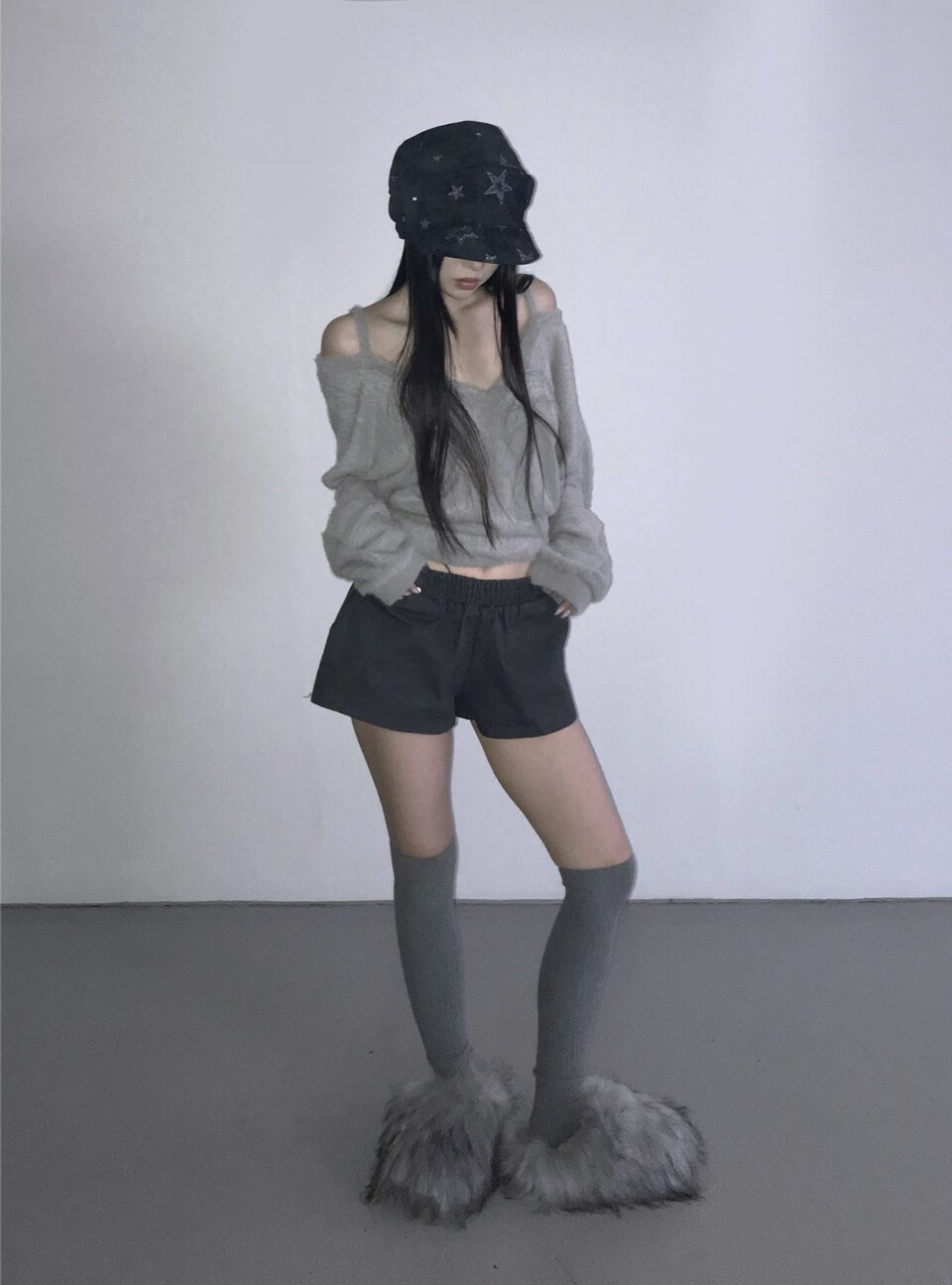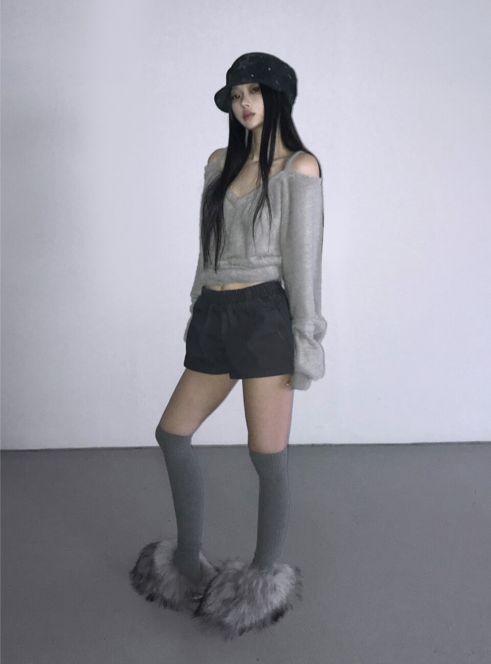 細肩帶露肩毛絨針織衫